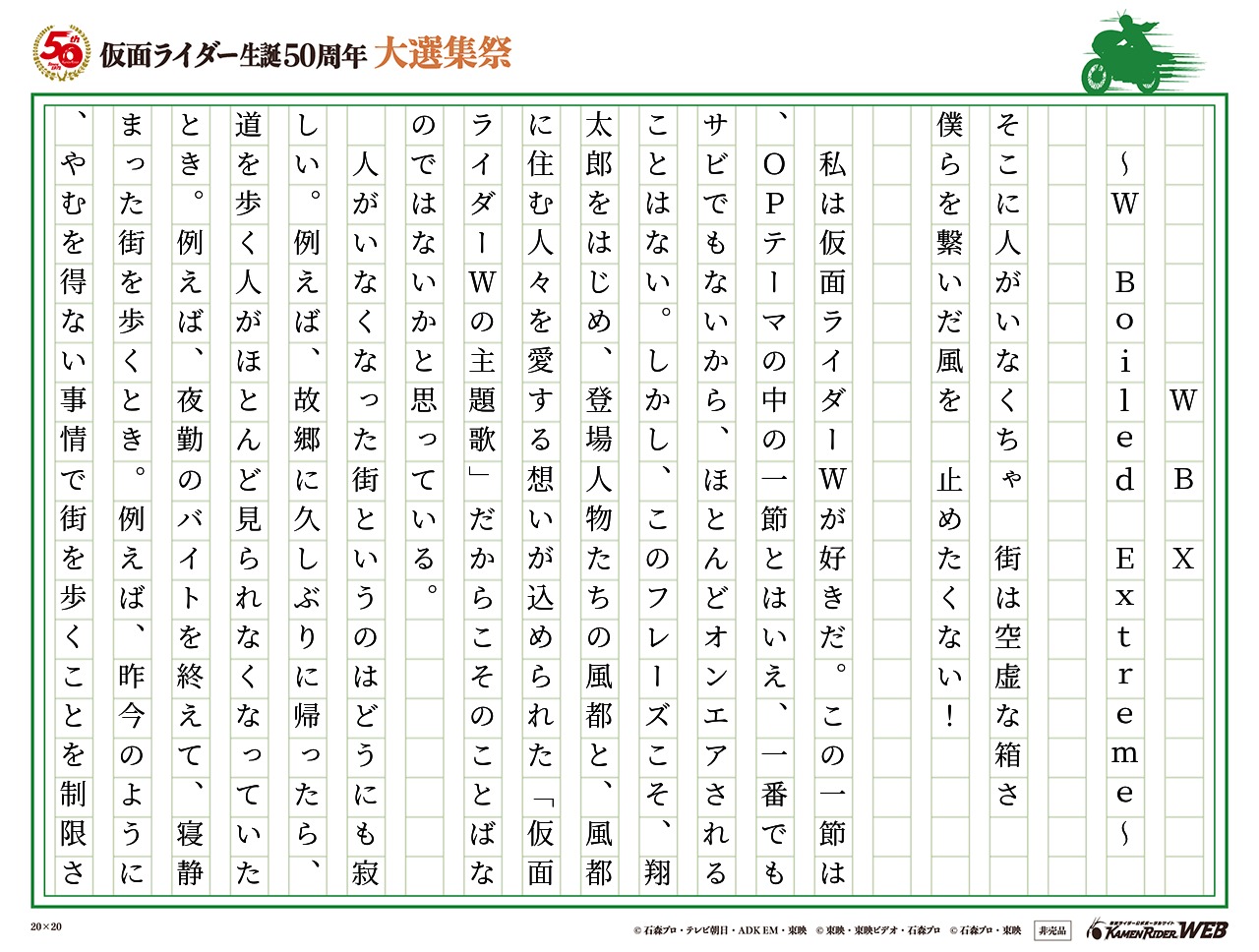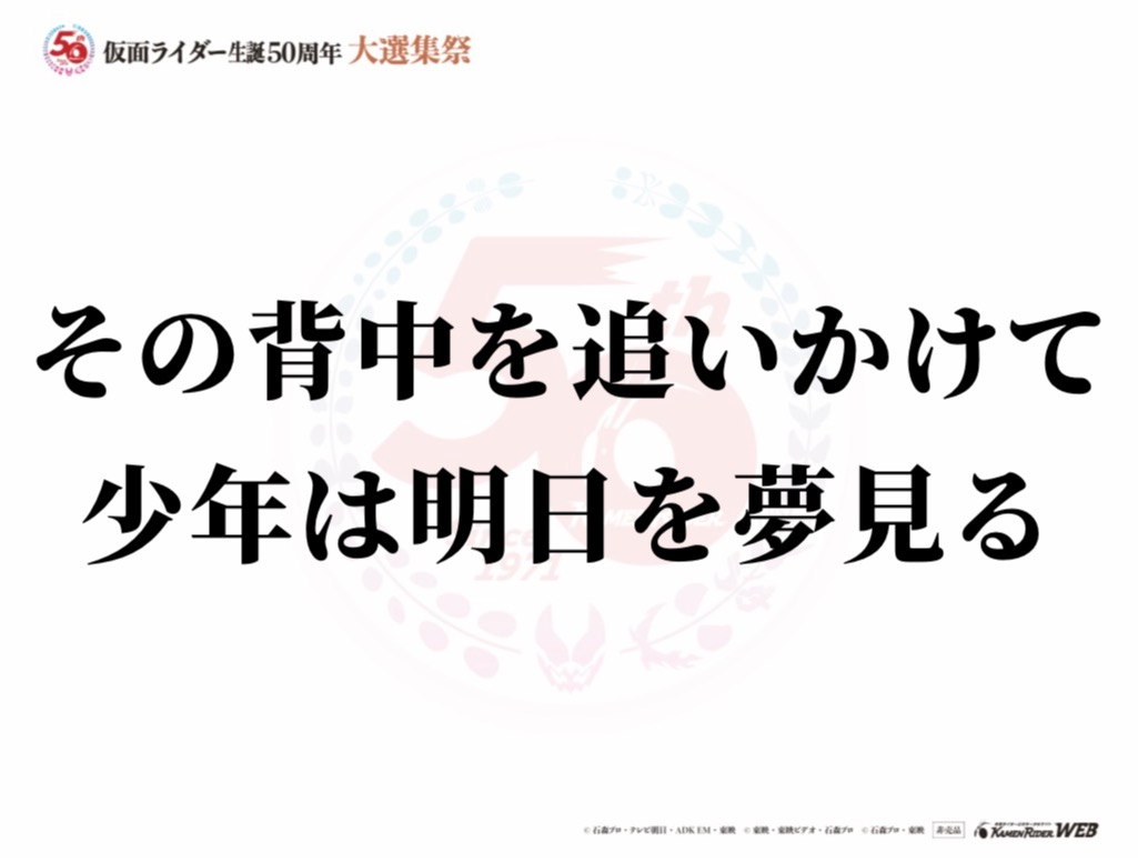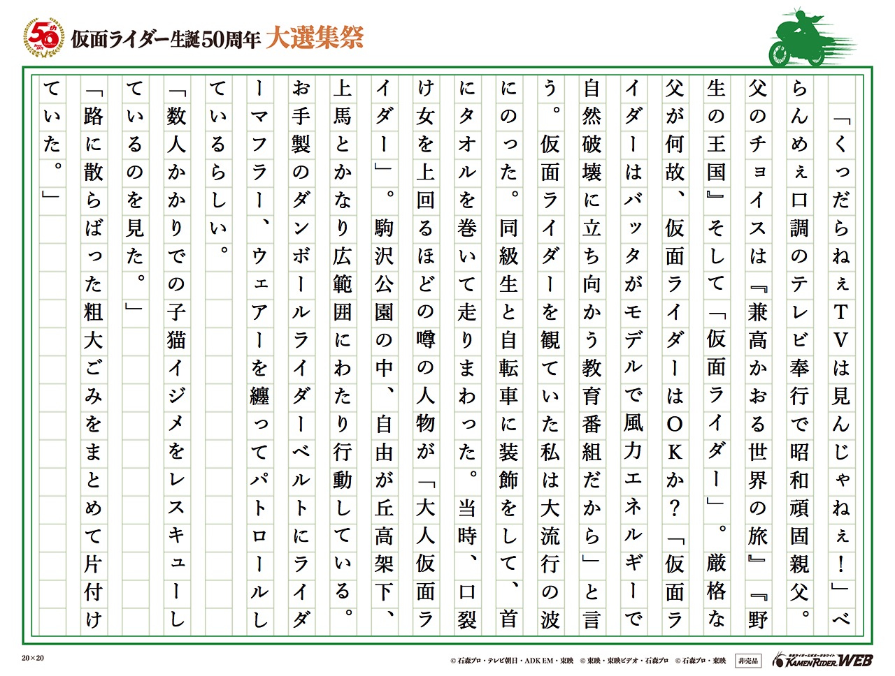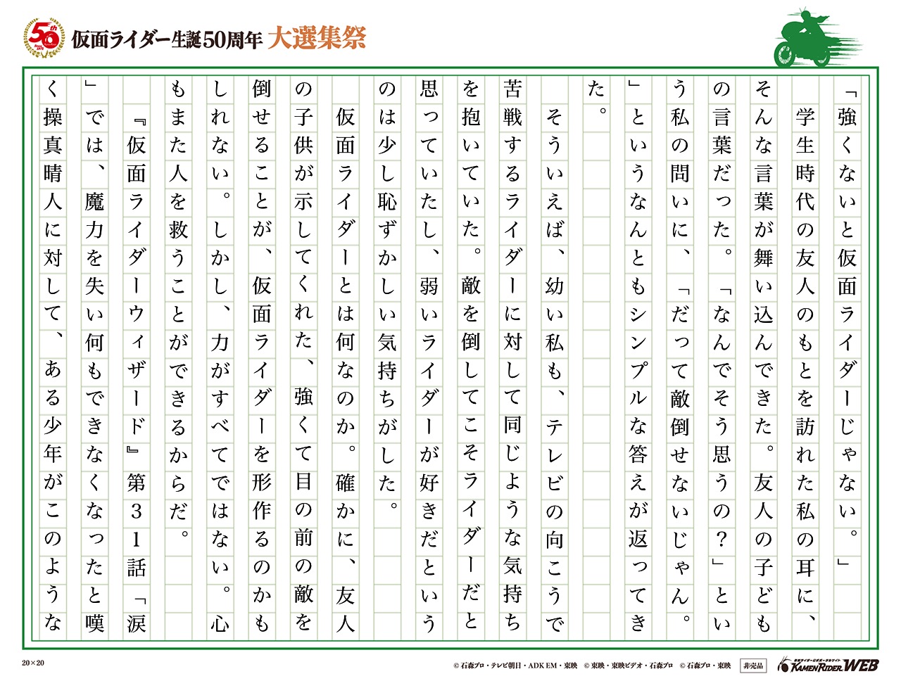 当サイトでは、皆様の仮面ライダーに対する「想い」をテーマ別に募集し、掲載させていただきます。募集テーマに対し、形式は、感想文、随筆、手紙、コメントなどさまざまな形で結構です。
