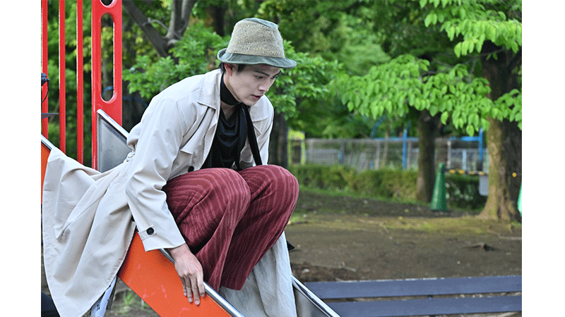 すべり台でこんな神妙な面持ちができる人、そういません。