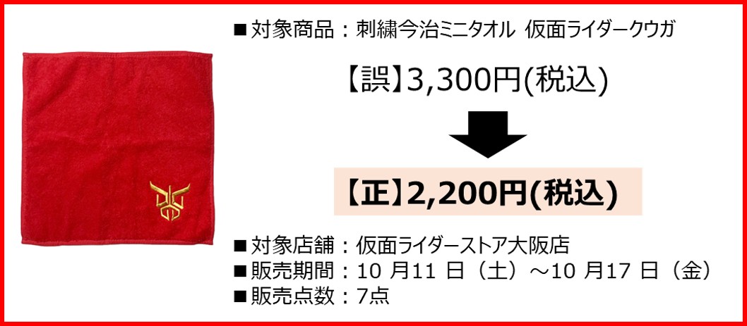 【仮面ライダーストア大阪店】商品販売価格の間違いに関する お詫びとお知らせ