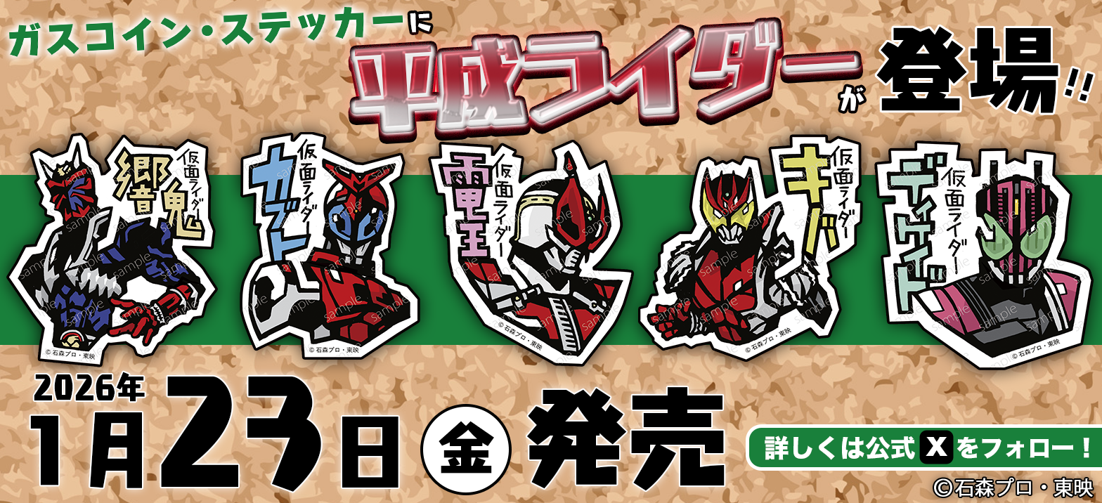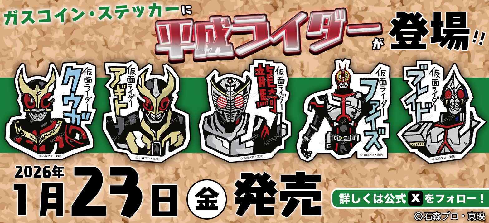 2026年1月23日(金)発売のガスコイン・ステッカーには「仮面ライダークウガ」「仮面ライダーアギト」「仮面ライダー龍騎」「仮面ライダーファイズ」「仮面ライダーブレイド」「仮面ライダー響鬼」「仮面ライダーカブト」「仮面ライダー電王」「仮面ライダーキバ」「仮面ライダーディケイド」の平成ライダー10作品が登場!