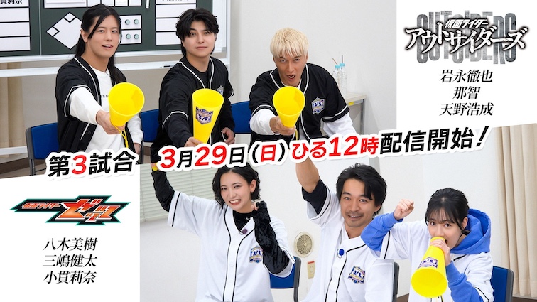 初戦は『王様戦隊キングオージャー』でギラ/クワガタオージャーを演じた【酒井大成】、ヤンマ・ガスト/トンボオージャー役の【渡辺碧斗】、ヒメノ・ラン/カマキリオージャー役の【村上愛花】、シオカラ役の【千綿勇平】によって結成された「キングちゃん」チームに、『仮面ライダーアインズ withガールズリミックス』に出演した鳴海亜樹子役の【山本ひかる】、九堂りんね/仮面ライダーマジェード役の【松本麗世】、桜井沙羅/仮面ライダーハクビ役の【志田音々】、三日月ナユタ/仮面ライダーアインズ役の【天翔天音】による「ガールズリミックス」チームが挑戦!
