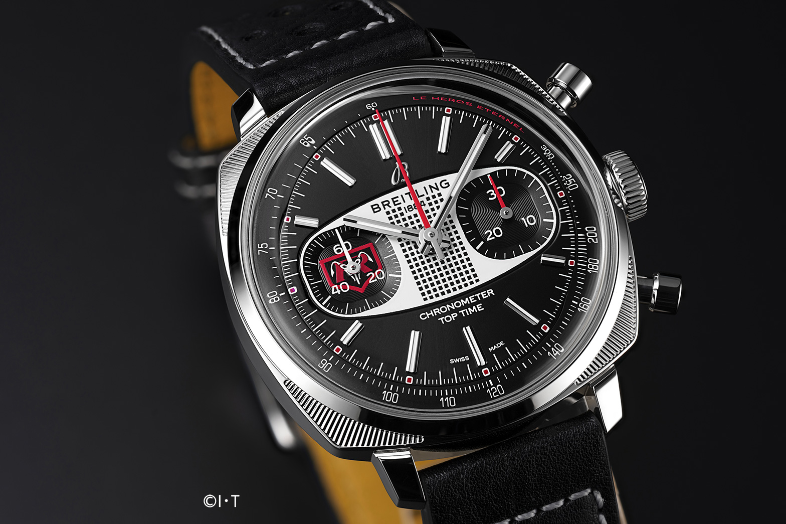 その自由で躍動感あふれる精神を受け継ぎ、「トップタイム B01 レーシング 仮面ライダー リミテッド」は、1971年に放映開始した仮面ライダー放映55周年を記念して誕生した日本限定モデルです。製造本数は周年にちなむ155本。9時位置のスモールセコンドにはさりげなくエンブレムを配し、文字盤外周には「LE HEROS ETERNAL(永遠のヒーロー)」の文字を刻みました。知る人だけが気づく、さりげないディテールです。