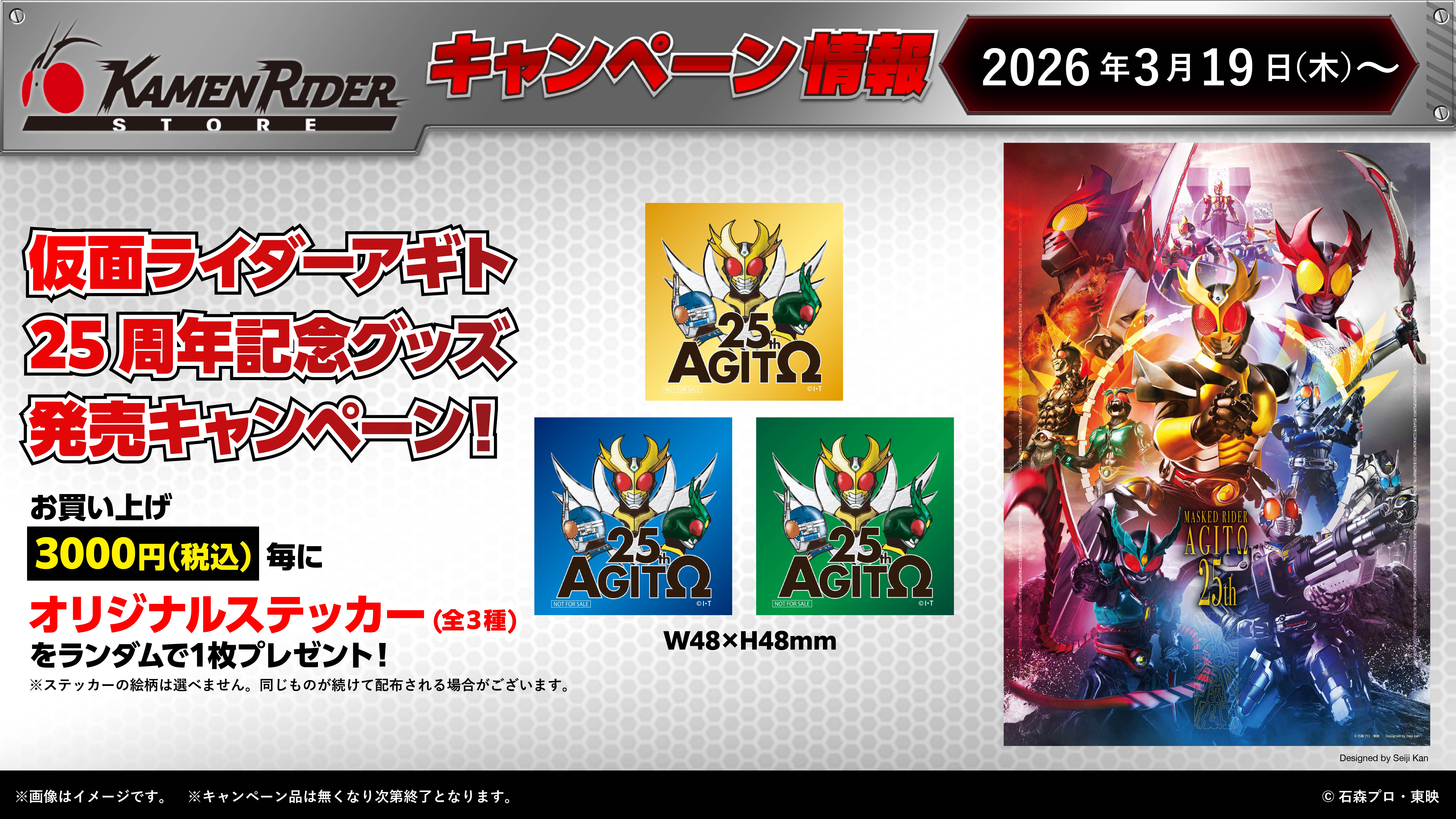 仮面ライダーアギト25周年フェアを記念して、お買い上げ3000円(税込)毎に「オリジナルステッカー(全3種)」をランダムで1枚プレゼント🎁