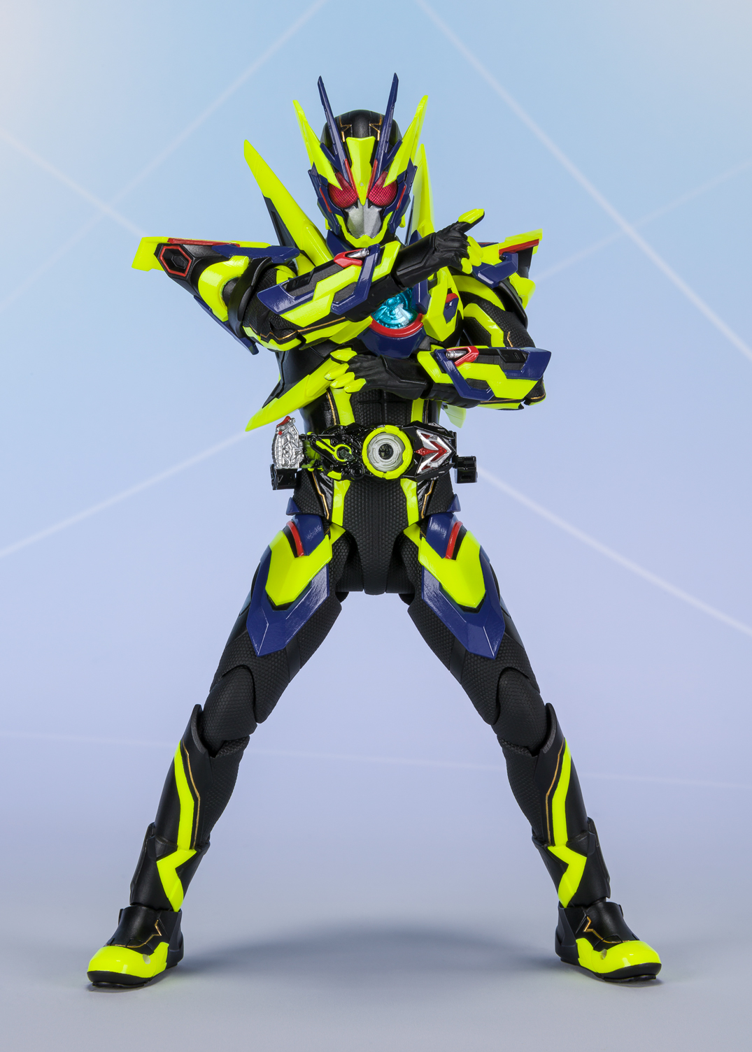 シンプル&スタイリッシュな基本フォームのゼロワン ライジングホッパーとはひと味違う、重厚感に満ちた姿に付属のオーソライズバスター(アックスモード)がフィットしており、実にさまざまなポーズで飾りたくなる魅力に満ちている。