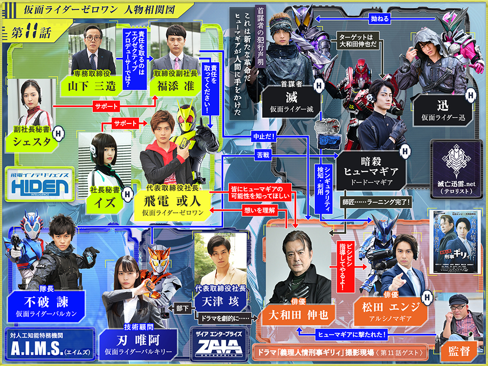 そして、三条さんが生み出したのが「イズの兄」を語る探偵ヒューマギアのワズです。イズとワズ。(※ワズは英語でイズの過去形。)なんとも意味深です。そしてさらに感慨深い出来事が。実は平行して高橋悠也さんが映画「仮面ライダー 令和ザ・ファースト・ジェネレーション」の執筆をしていたのですが、その中で登場したのがウィルというこれまたヒューマギアの社長秘書のキャラクターでした。(※ウィルは英語の未来をさす助動詞。)飛電のヒューマギアの鍵を握る過去・現在・未来のキャラクターを同時に作っていたこの時期。そうです、12月21日(土)の「ザ・ファースト・ジェネレーション」につながり始める大切な要素も本編の中に転がっているかもしれません。テレビも映画も今後注目です! ひきつづきお楽しみに!!