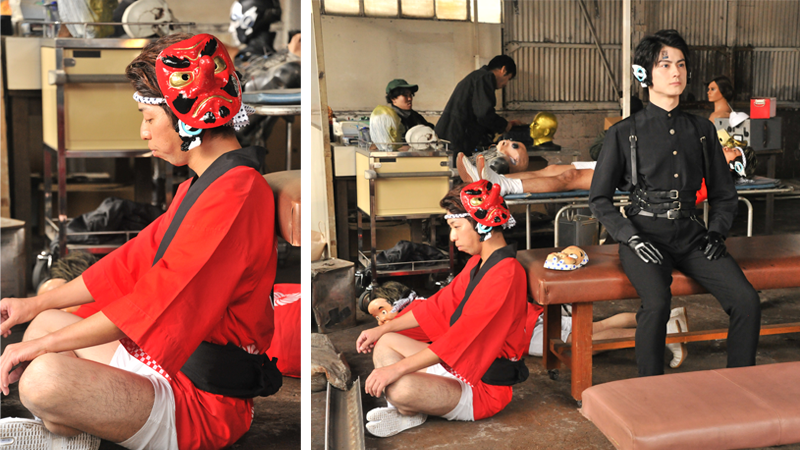 ワズによって明らかになった暗殺ちゃんの謎。それは暗殺ちゃんは元々は祭田ゼットというイベント用ヒューマギアだったという驚愕の事実でした。この改造前を演じていただいたのは吉田快さん。「R-ART-WORKS」というよさこい総合プロデュースユニットの主催として、振付師、ダンサーとしても活躍されている吉田さん。祭田ゼット用のダンスを製作するに辺り吉田さんへ振り付けと楽曲をお願いすることになり、ダメ元で「ご出演もお願いできませんか?」と聞いてみたところ、快諾していただき、今回の出演となりました。なので、劇中でのダンスは完璧。ワズの探し当てた資料映像では1号~5号まで、5人の祭田ゼットが踊っていましたが、この5人は一人一人お面を変えて振りも変えて5回踊っているのです。こちらもプロのなせる業です。