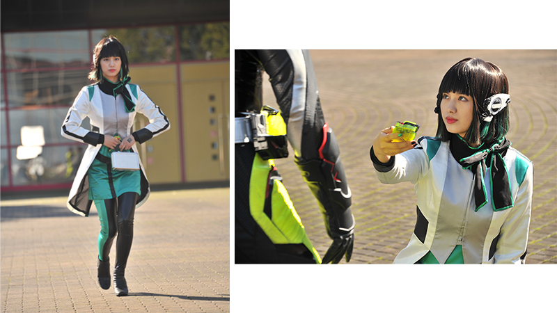 そしてスライディングはさすがにJAEのアクション部の女性にご協力いただき、アナザーイズとして滑っていただきました。ですが、イズがゼロワンにキーを握らせるカットはオリジナルイズ。鶴嶋さんをカメラマン用の台車に載せて引き、撮影しています。多彩な撮影手法を次々と体験している鶴嶋さん。彼女もシンギュラリティを超える勢いで日々ラーニングしています。
