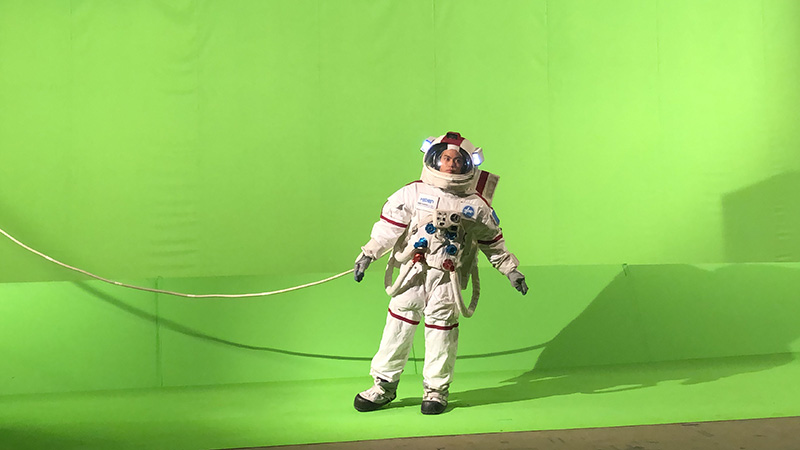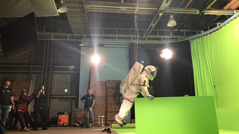 宇宙空間シーンの撮影でも、操演部とアクション部が分厚い宇宙服を吊り、演出部がケーブルの揺らめきを表現し、照明部が太陽光を作り、撮影部はカメラを傾けて撮影し、美術部の作成したグリーンの箱をライズホッパーに見立てて、特撮でCG合成などなど。短い時間の中にありとあらゆる特撮技術が詰め込まれていました。