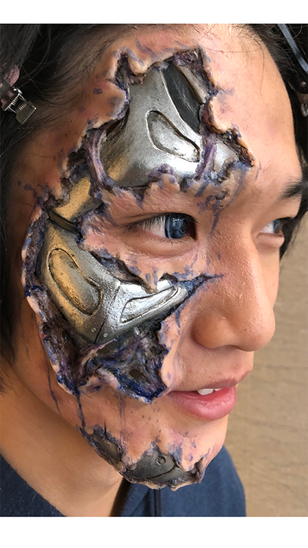 カラコンも入れ、顔の半分を丸ごと覆う形の特殊メイクに、「顔が全然動かないです」と中川さん。
