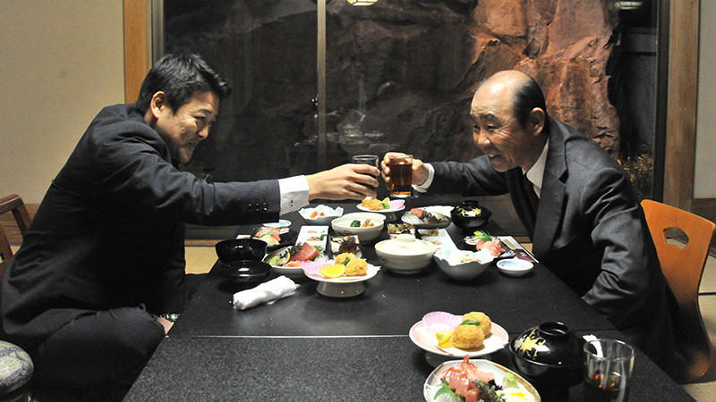 お仕事五番勝負のラストを飾る《演説対決》において、ZAIA側の政治家・由藤政光を演じてくださったのは大塩ゴウさん。“人間の悪意”を描くストーリーの上、黒い面を持つ政治家という役どころでしたが、力強い選挙演説はもちろん、越後屋お前も悪よのぅ…と囁く声の聞こえてきそうな名シーンを雰囲気たっぷりに演じてくださいました。それもそのはず、大塩さんはキャスティングの際に映像資料を見た杉原監督が「これぞ由藤!」と太鼓判を押し、即決するほどの抜群の演技力の持ち主。