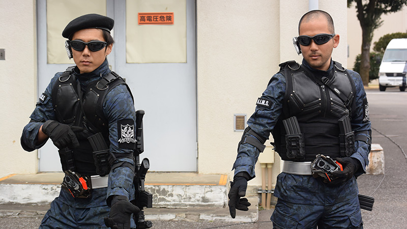 帽子が特徴の隊員、出川を演じたのはブラッドスタークやリュウソウゴールドのスーツアクターを務めていた岡田和也さん。そして、坊主の隊員はゼロワンで多くのマギア怪人を務めてくださっている榮男樹さんです。普段スーツアクターを務めているお二人の素顔の演技はとってもレア!!