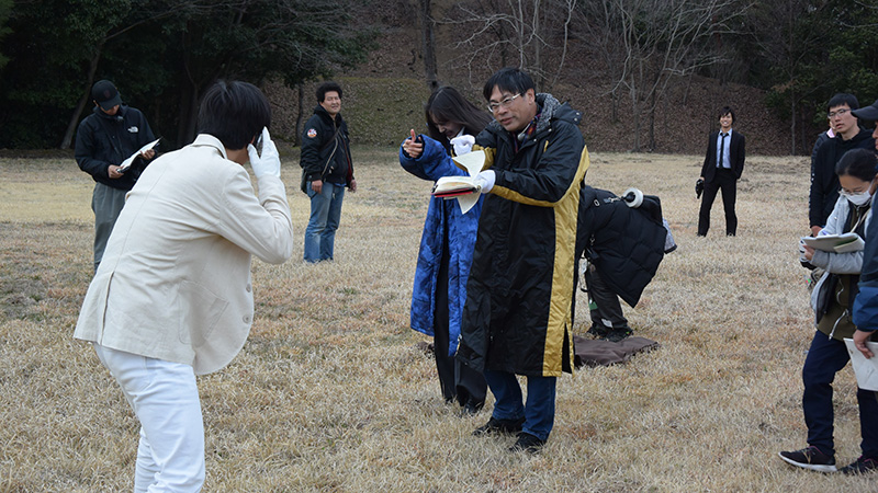 この日の撮影のラストを飾るシリアスなシーン。……でしたが、田崎監督はじめ、スタッフの間にはちらほらと笑顔が。不破諫役・岡田龍太郎さんの白い歯が遠くからでも眩しく光っています。