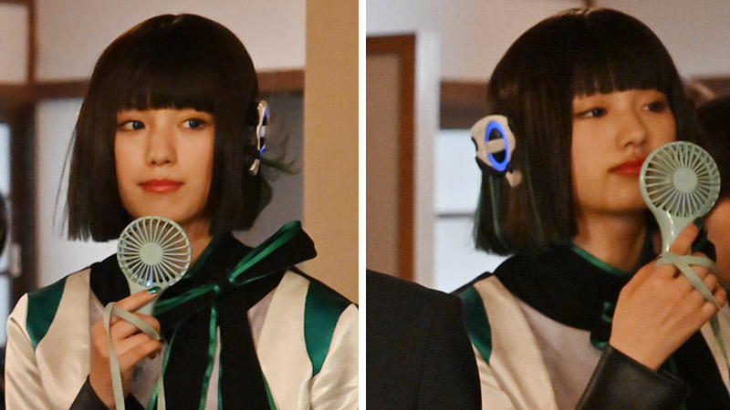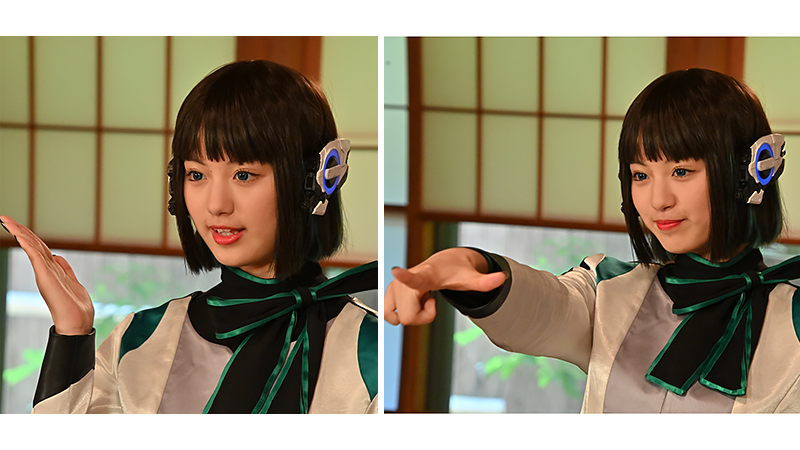 3、4話のクランクインは7月半ば。長かった梅雨が明けたと思った途端、連日35℃越えの猛暑日が現場を襲いました。或人役高橋文哉くんを始め、キャストたちはみなその暑さと戦いながらの撮影だったわけですが、特にその影響をダイレクトに受けてしまったのがイズ役の鶴嶋乃愛さん。イズの衣装は全身が覆われる上、ウィッグを被り、さらにヘッドパーツまで付けるので、まったく熱の逃げ場がないのです。カットが掛かる度、氷嚢や飲み物を用意してスタッフも全力で鶴嶋さんを支えました。クールな社長秘書AIロボは、キャスト・スタッフ皆の熱い頑張りによって作られているのです。