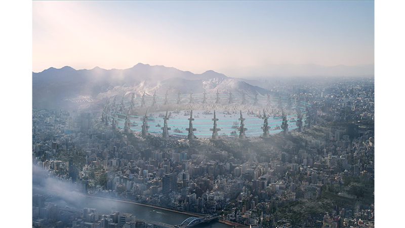 このデイブレイクタウンは、緻密に描かれたイラストを実写映像と合成することで、その空間が現実に存在するかのように見せる「マットペイント」と呼ばれる手法によって表現されています。