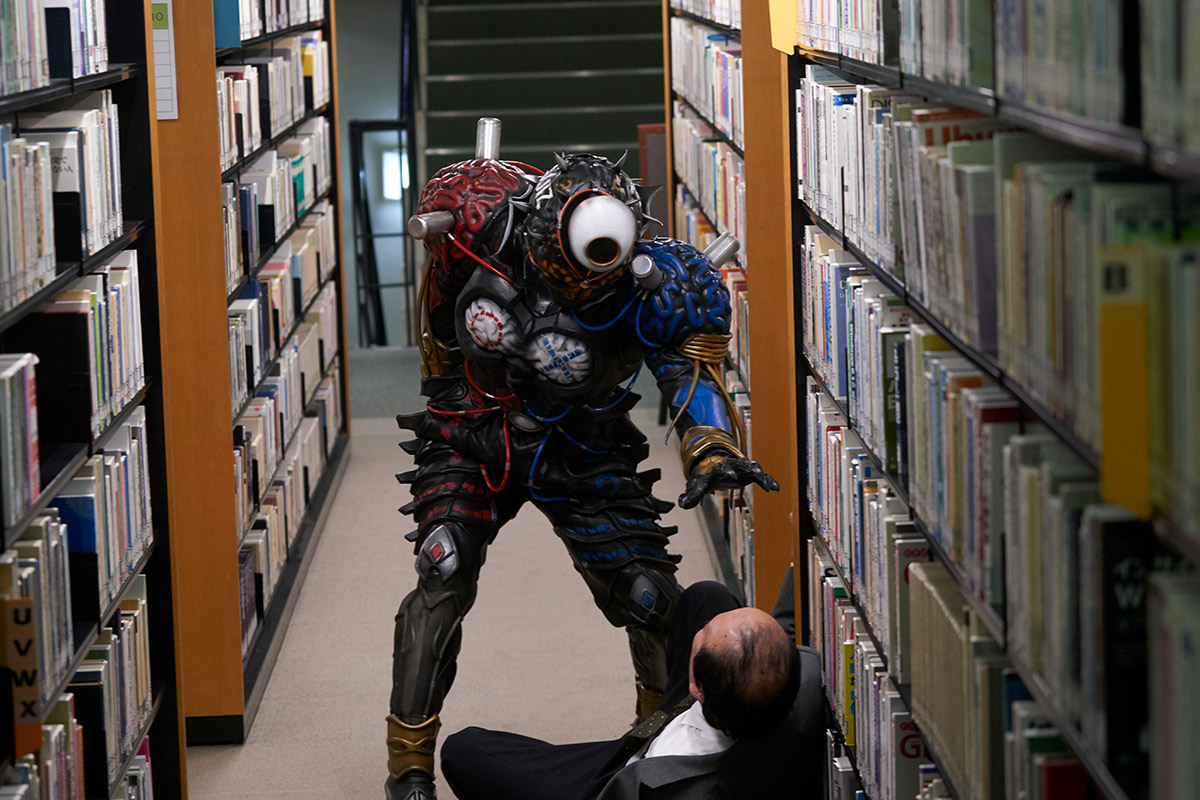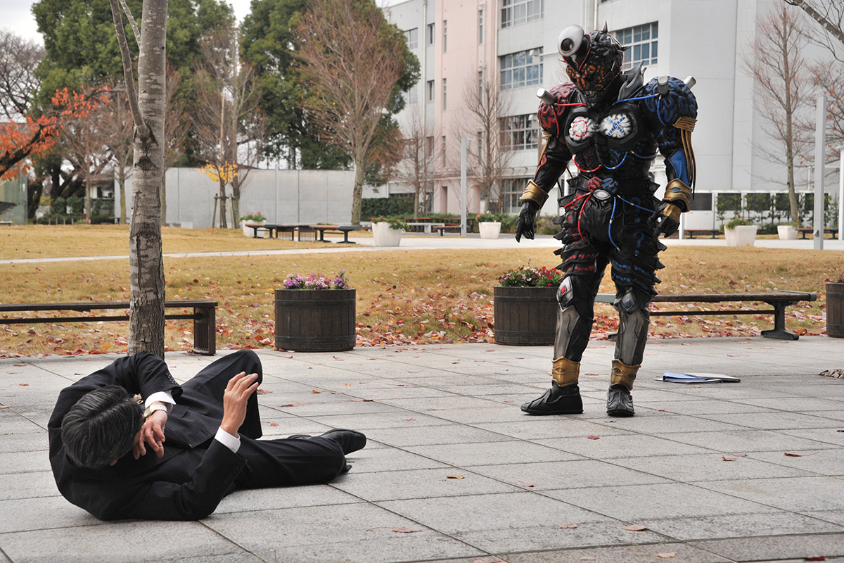 ここに裏設定がありまして。テレビドラマジャンルの失墜がつづく今日このごろ。このまま進めば、2040年頃には『仮面ライダー』といえどもバラエティ番組と変わらないものになっていてもおかしくない……と。逆に言えば、どれほど環境が激変しても、仮面ライダーは番組として存続しているだろうという明るい展望の表れともいえます。