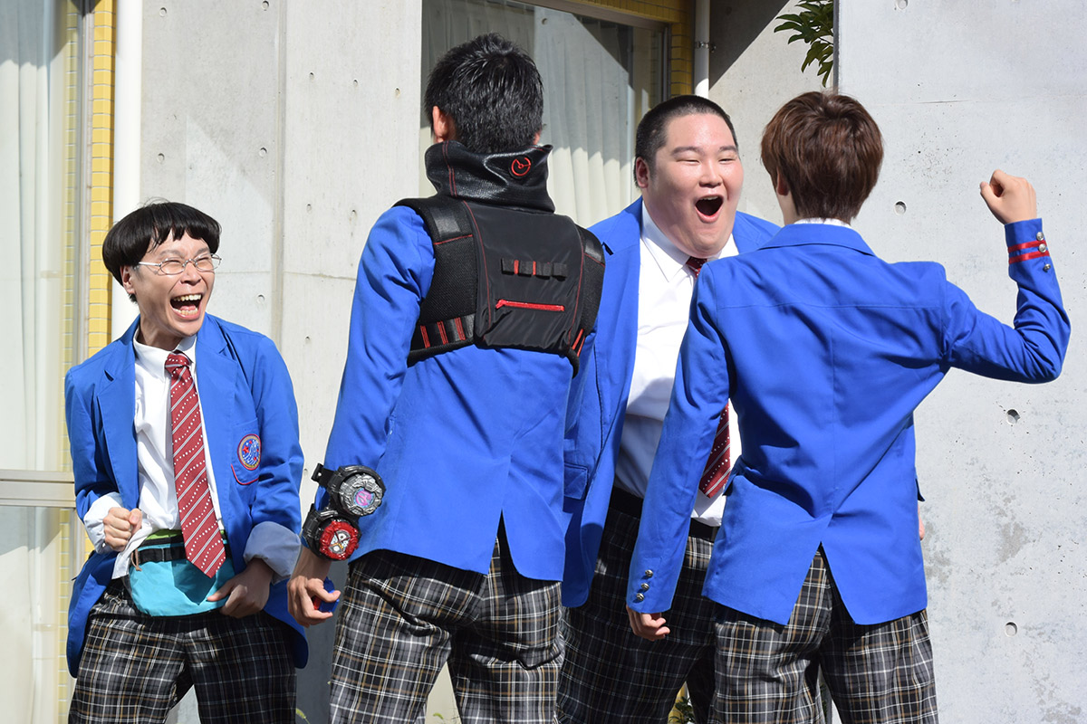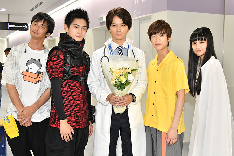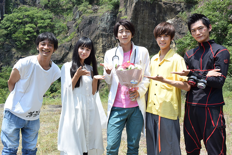 今回は、「仮面ライダーエグゼイド」より宝生永夢役飯島寛騎さん、鏡飛彩役瀬戸利樹さんに客演していただきました!お写真は、お二人のクランクアップ時!エグゼイドのパイロット監督、中澤監督とともに、にこやか〜な雰囲気です。