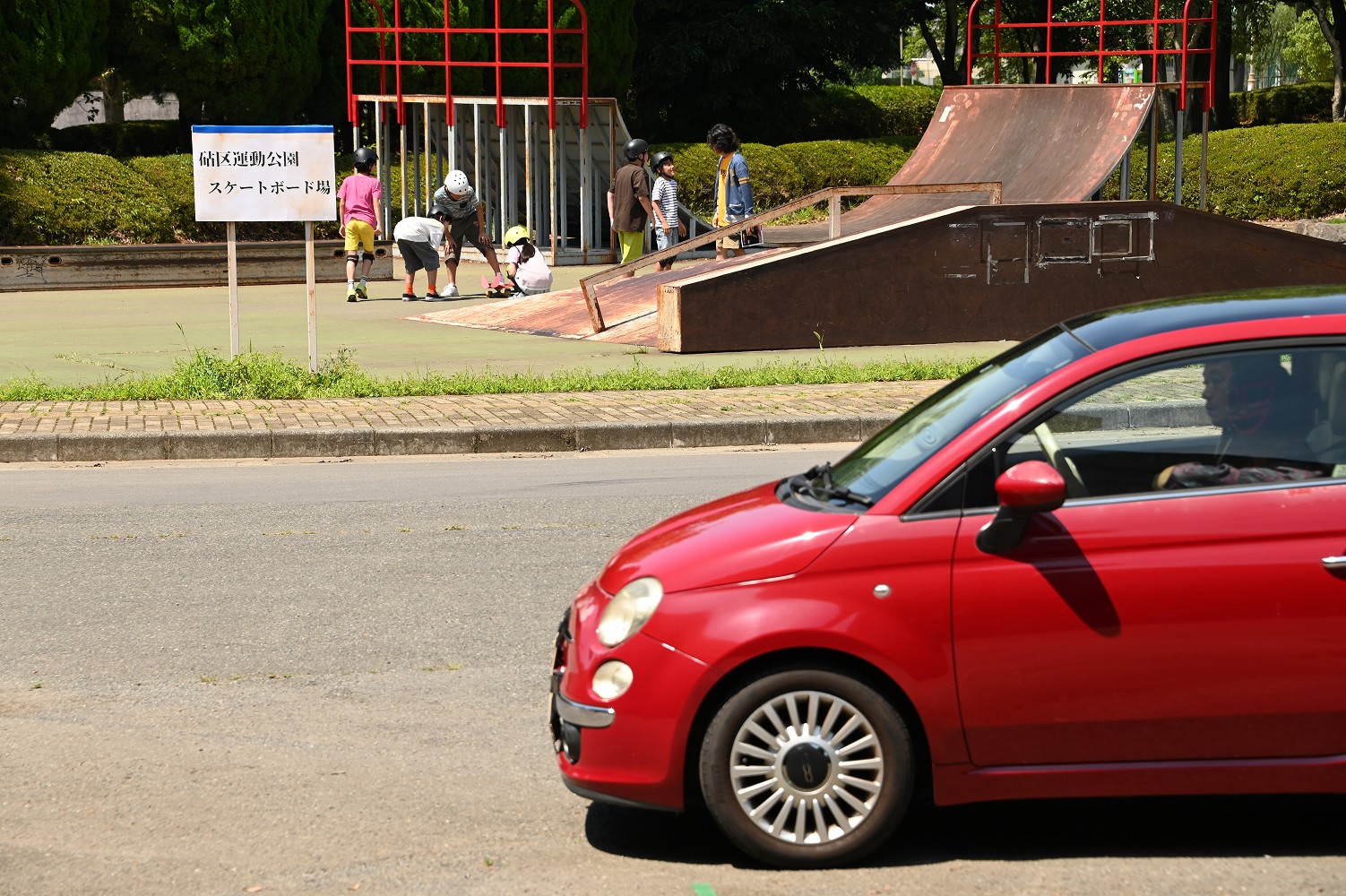 「砧区運動公園」のスケートボード場で遊んでいた子供たち。