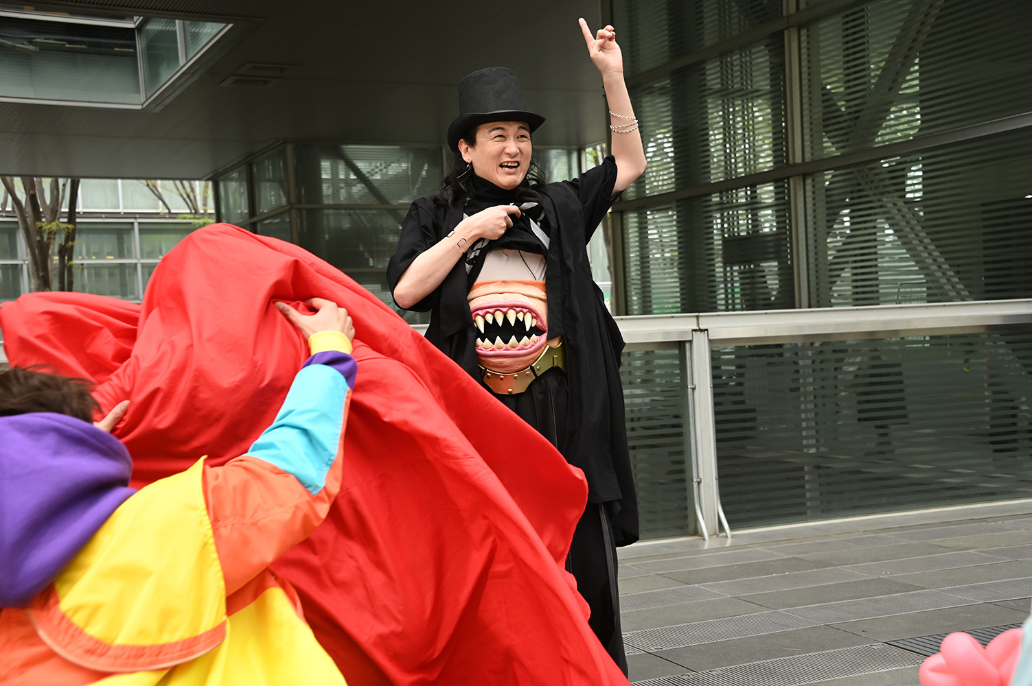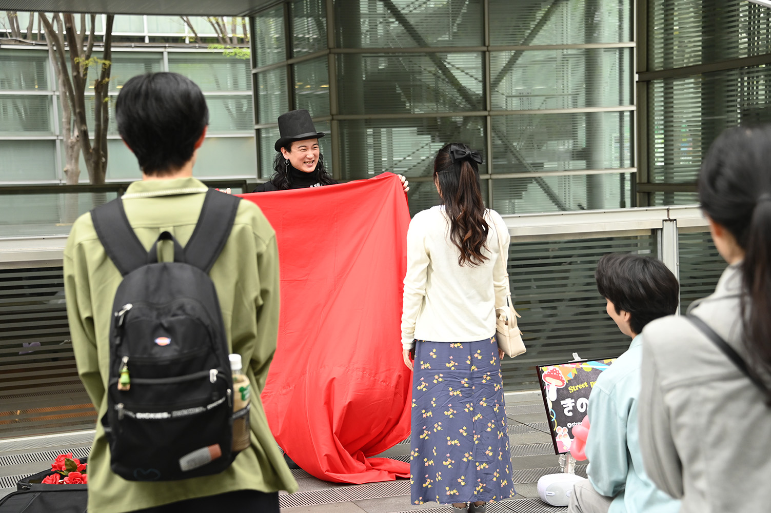 おたけにんげんたいのだいどうげいをみていたじょせいオタケ人間態の大道芸を見ていた女性