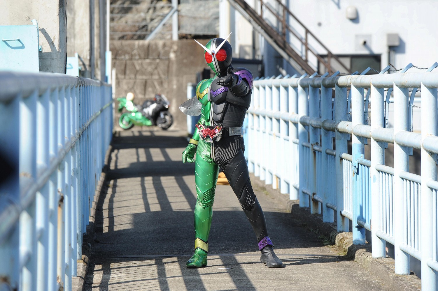 サイクロンメモリとジョーカーメモリを用いて変身した仮面ライダーW(ダブル)。