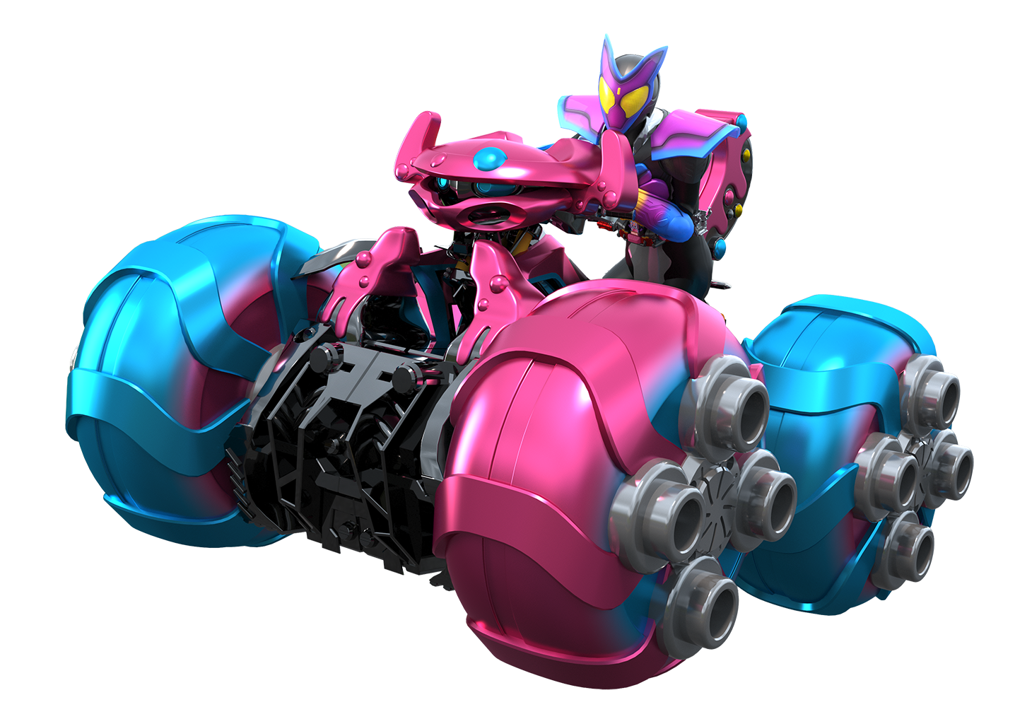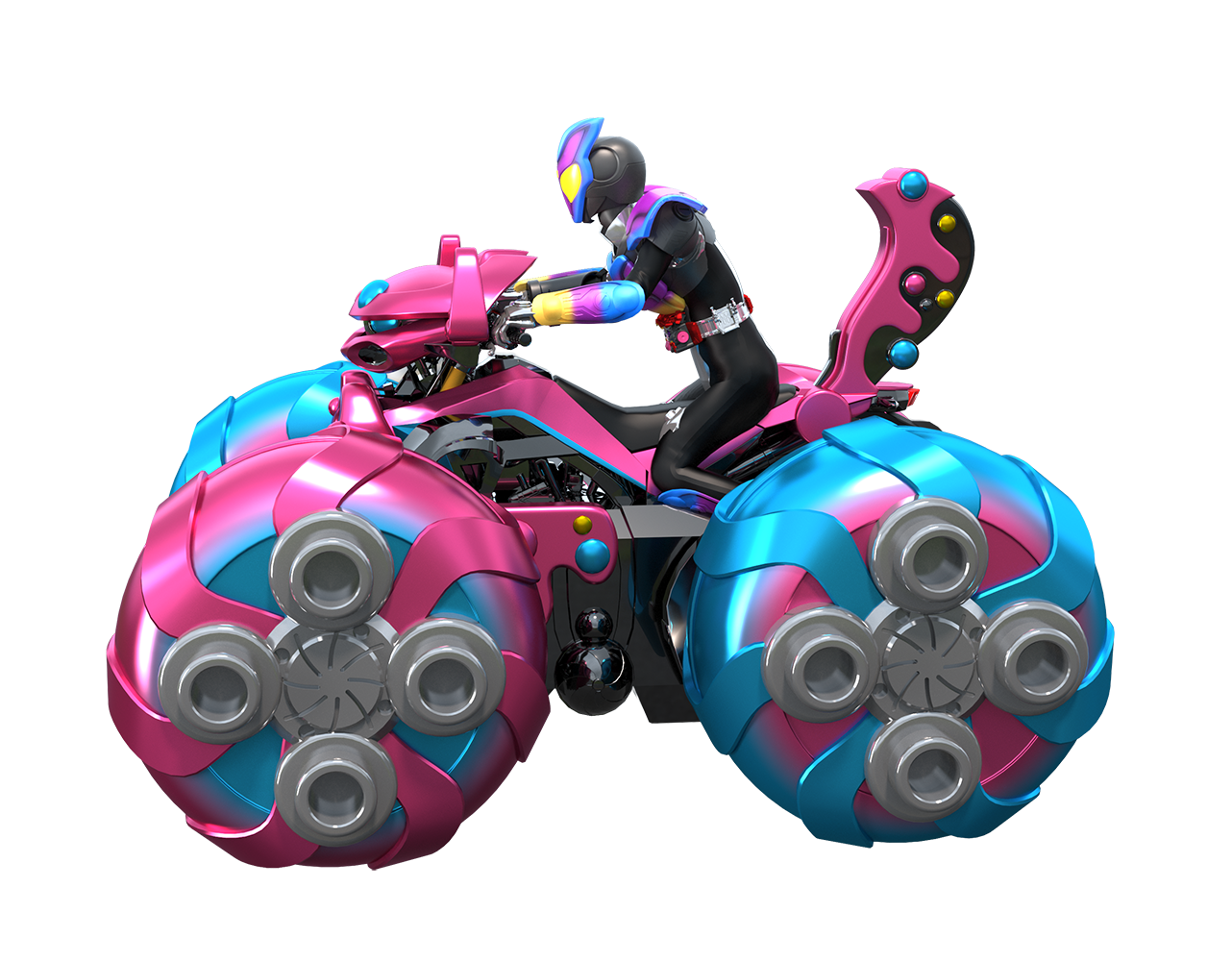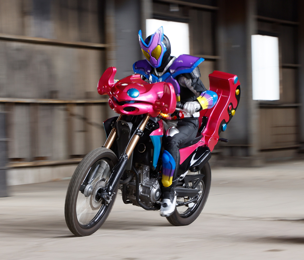 銃型武材「ブルキャンガトリング」への変形に加え、公道を走る一般的なバイクの形態への変化も可能となっている。