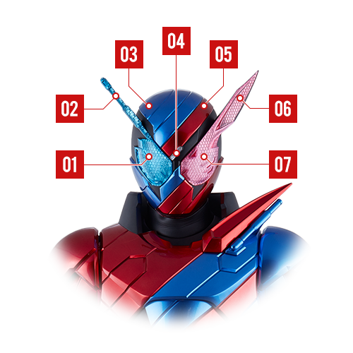 仮面ライダービルドの頭部を保護する赤い装甲パーツ。スマッシュの通常攻撃に耐え得る強度を備えており、運動性能を高めるための軽量化も施されている。